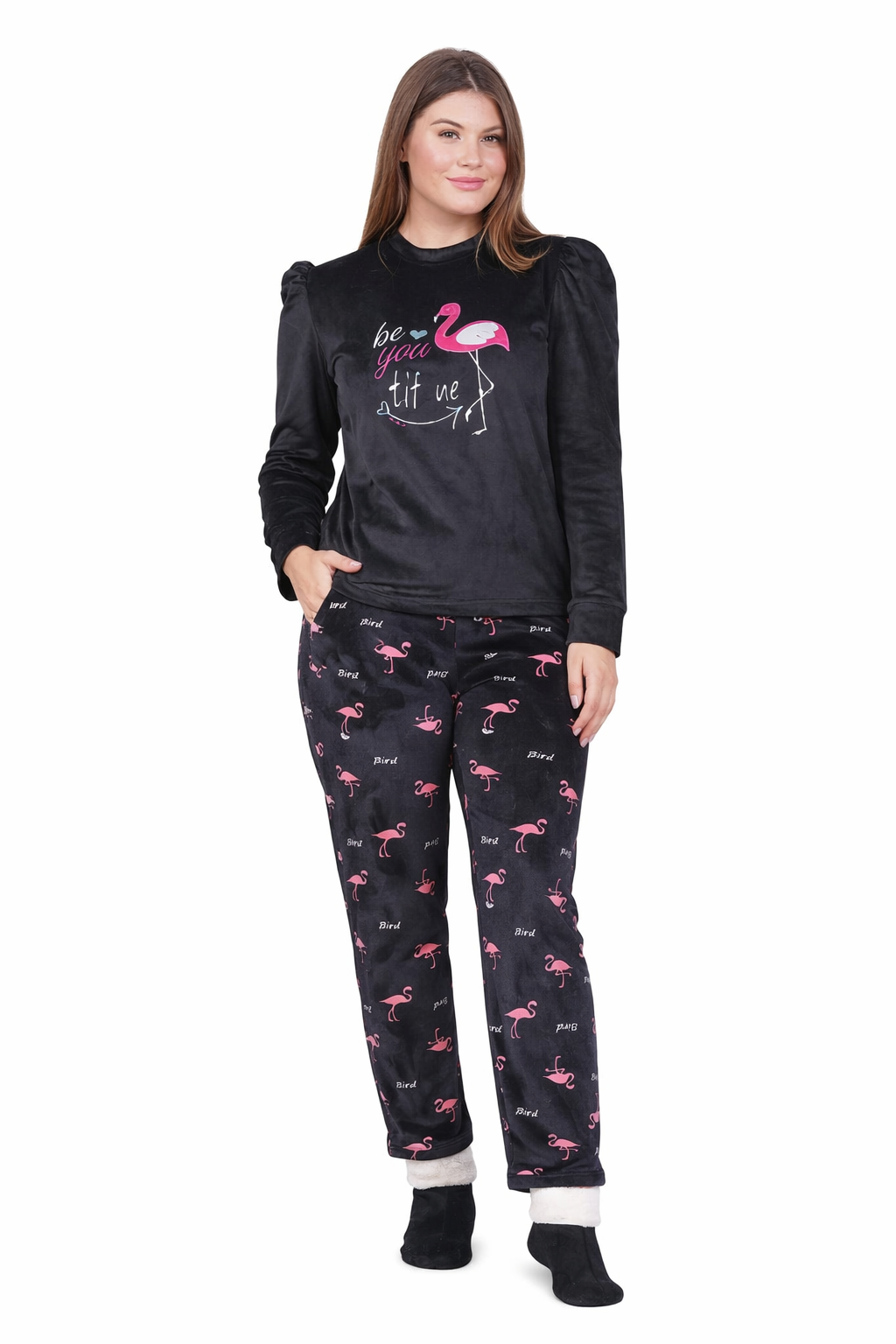 Keywords: women pajama set, flamingo pajamas, cozy sleepwear, printed nightwear, soft loungewear, winter pajamas