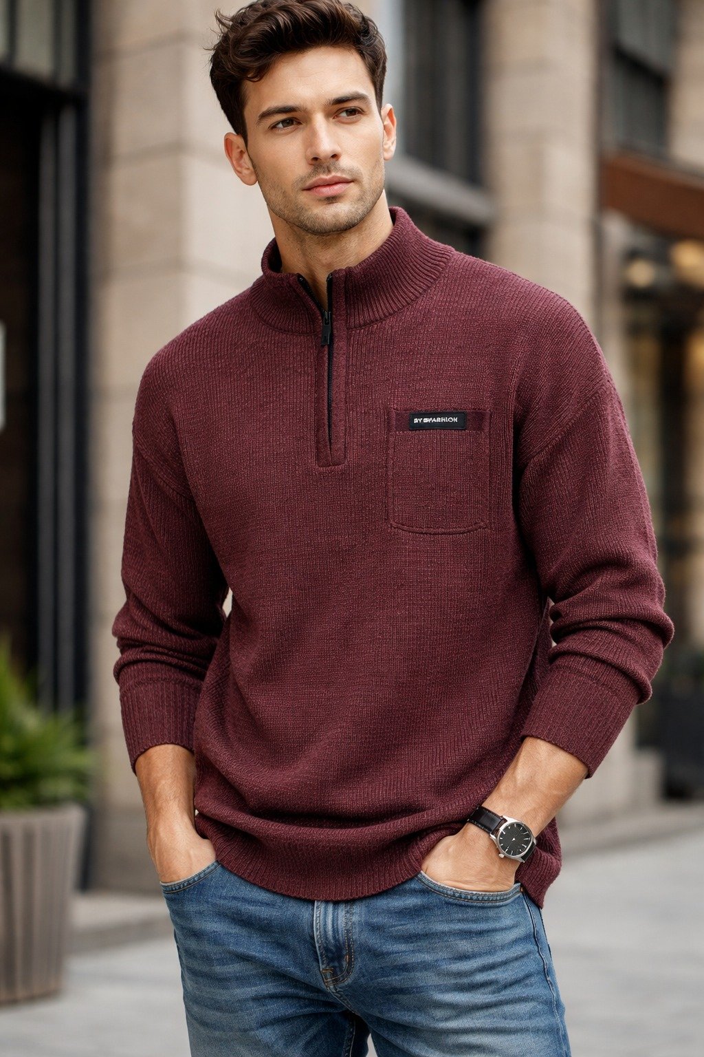 Stay sharp with the Urban Zip Knit — a modern men’s half-zip sweater crafted from soft, breathable knit fabric for all-day comfort. Featuring a clean chest pocket, ribbed cuffs, and a smart stand-up collar, this pullover is perfect for casual wear, office looks, or weekend outfits. Available in multiple stylish colors including blue, black, and burgundy. Easy to style with jeans or chinos, this men’s knit sweater delivers warmth, durability, and timeless fashion in one essential piece.
